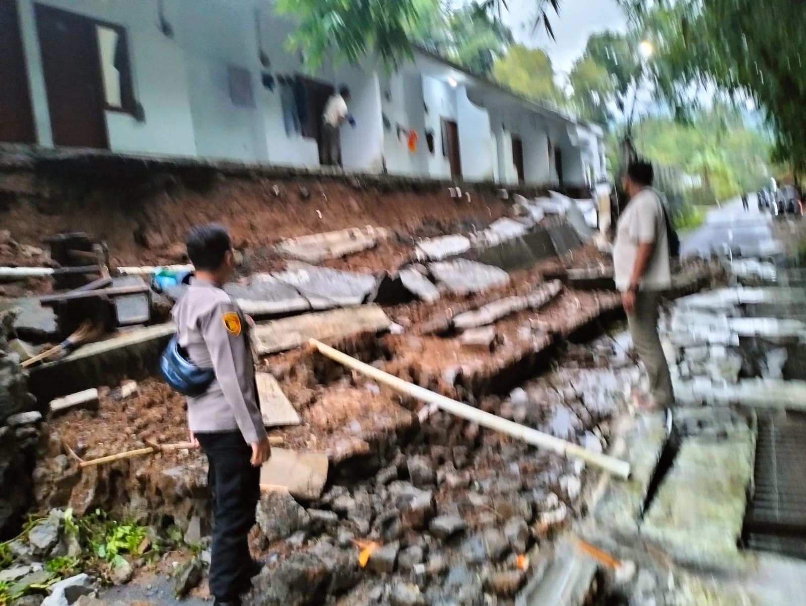 CIAMIS ~ Personel Polsek Cihaurbeuti Polres Ciamis Polda Jabar mendatangi lokasi bencana alam di Desa Sukahaji. Bencana alam ini tepatnya terjadi pada Benteng Mess Pabrik Otak-Otak di Dusun Mancagar Rt 03 Rw 04, Desa Sukahaji, Kecamatan Cihaurbeuti, Kabupaten Ciamis, Jawa Barat, Minggu (26/1/2025).