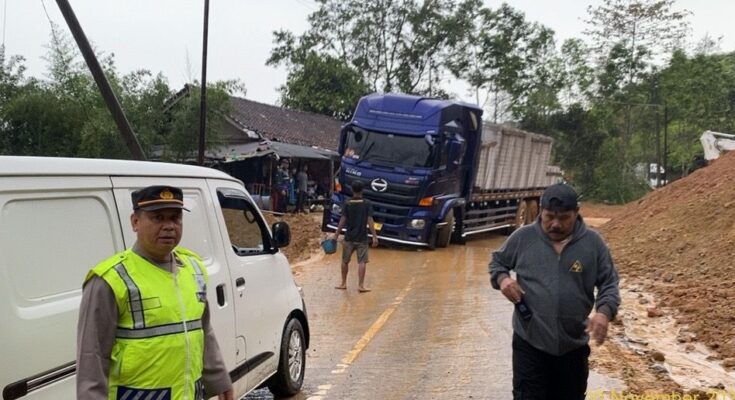 Garut | Polsek Cikajang Polres Garut melakukan evakuasi terhadap satu unit kendaraan tronton bermuatan hebel yang tergelincir di wilayah Kecamatan Cikajang. Kamis (20/11/2025).