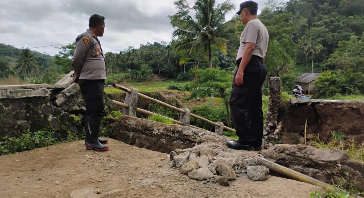 Garut | Personel Polsek Cikelet Polres Garut yang dipimpin langsung oleh Kapolsek Cikelet IPTU Aktas Komalsyah, S.H. bersama anggota melaksanakan pengecekan lokasi jembatan ambruk di Jembatan Cisitu, Jalan Desa yang menghubungkan Desa Karangsari dengan Desa Kertamukti, Kecamatan Cikelet, Kabupaten Garut, Minggu (18/1/2026).