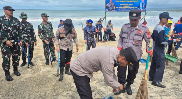 Garut | Polsek Cikelet Polres Garut melaksanakan kegiatan Program Jabar Raksa Sagara berupa aksi bersih-bersih pantai yang digelar secara gabungan bersama berbagai dinas dan instansi terkait di wilayah hukum Cikelet.