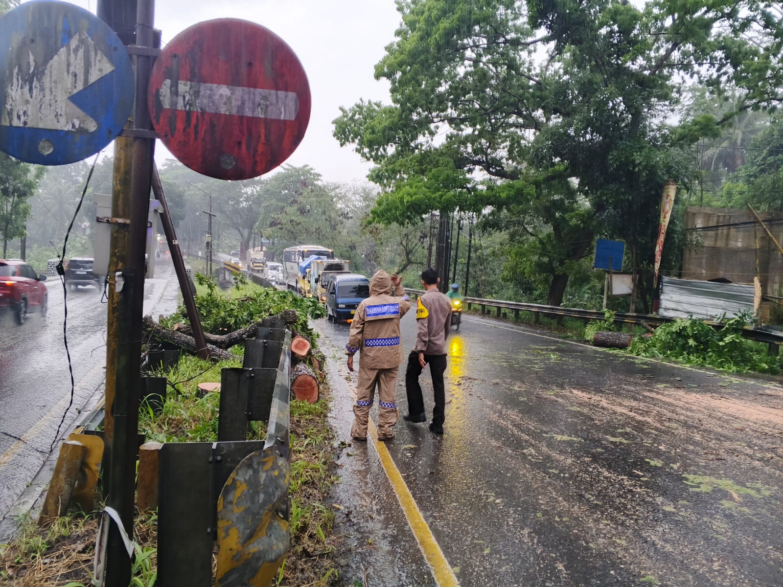 “Akses jalan sempat terhambat, namun kini sudah kembali normal. Semua material pohon tumbang berhasil dibersihkan dengan cepat,” kata Kompol Husen Sujana.