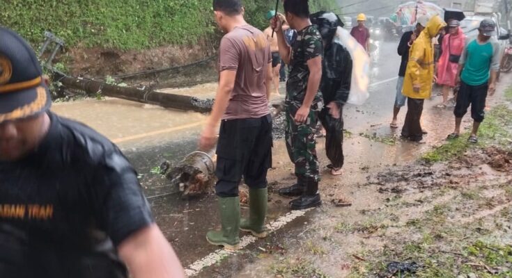 Selain menutup akses jalan, satu unit tiang listrik juga ikut tumbang, sehingga menimbulkan potensi bahaya bagi pengguna jalan.