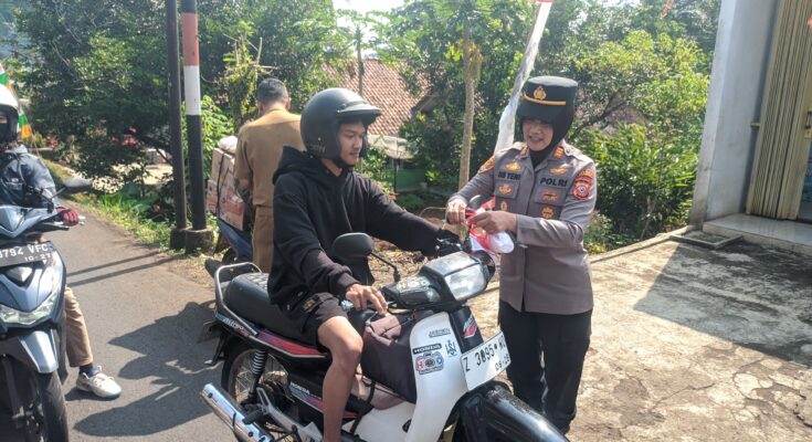 Ciamis — Dalam rangka menyemarakkan peringatan Hari Ulang Tahun Kemerdekaan Republik Indonesia ke-80, Polsek Kawali Polres Ciamis bersama unsur pemerintah kecamatan melaksanakan kegiatan pembagian bendera Merah Putih kepada pengendara roda dua dan rumah-rumah warga di wilayah Kecamatan Jatinagara, Kabupaten Ciamis, Senin (11/08/2025).