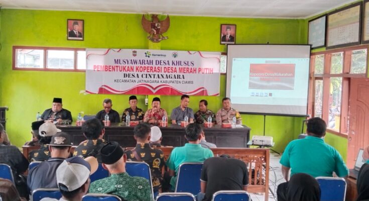 Ciamis – Kepolisian Sektor (Polsek) Kawali menunjukkan komitmennya dalam mendukung pembangunan dan pemberdayaan ekonomi masyarakat desa. Hal ini tampak dalam kehadiran langsung Bhabinkamtibmas Desa Cintanagara dalam kegiatan Musyawarah Desa Khusus (Musdes Sus) pembentukan Koperasi Desa Merah Putih yang digelar pada Jumat (16/5/2025) di Aula Bale Desa Cintanagara, Kecamatan Jatinagara, Kabupaten Ciamis.