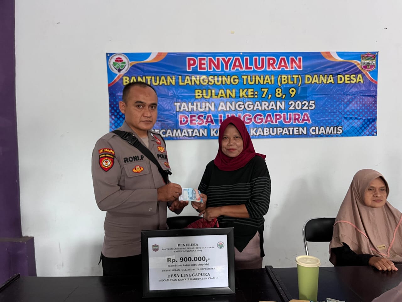 CIAMIS ~ Polsek Kawali Polres Ciamis Polda Jabar monitoring penyaluran Bantuan Langsung Tunai (BLT) warga masyarakat Desa Linggapura. Kegiatan itu dilaksanakan di Aula Desa Linggapura, Kecamatan Kawali, Kabupaten Ciamis, Jawa Barat, Kamis (18/9/2025).