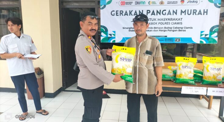 Ciamis – Polsek Lakbok Polres Ciamis kembali menunjukkan kepeduliannya terhadap kebutuhan masyarakat dengan mengawal langsung kegiatan penyaluran sekaligus penjualan beras program Stabilisasi Pasokan dan Harga Pangan (SPHP) yang berlangsung di halaman Kantor Polsek Lakbok, Kabupaten Ciamis, Selasa (26/08/2025).