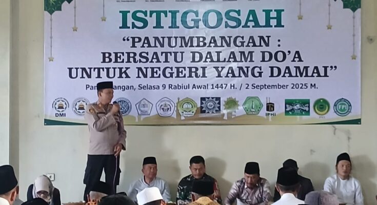 CIAMIS ~ Jajaran Polsek Panumbangan Polres Ciamis Polda Jawa Barat menghadiri istigosah dan doa bersama untuk para korban aksi unjuk rasa yang terjadi di sejumlah wilayah di Indonesia beberapa waktu lalu. Acara bertajuk “Panumbangan Bersatu dalam Do’a Untuk Negeri Yang Damai” ini berlangsung di Gedung KBOK, Kecamatan Panumbangan, Kabupaten Ciamis, Jawa Barat, Selasa (2/9/2025).