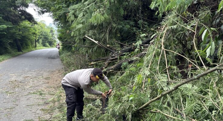 “Setelah menerima laporan, anggota kami langsung turun ke lokasi untuk melaksanakan cek TKP dan membersihkan material pohon tumbang yang menghalangi jalan. Berkat kerja sama dengan warga, jalur dapat kembali dibuka dan arus lalu lintas sudah normal di kedua arah,” ujarnya.