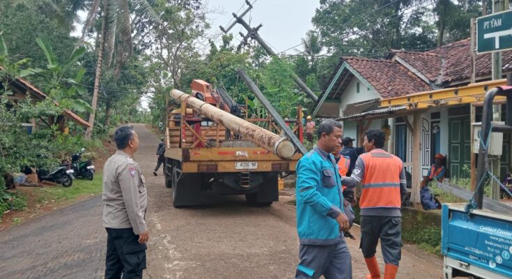 CIAMIS ~ Personel Polsek Sukadana Polres Ciamis Polda Jabar melakukan evakuasi pohon tumbang yang menimpa tiang listrik di Desa Ciparigi. Tepatnya rumah milik Jamal di Dusun Citamiang Wetan, Desa Ciparigi, Kecamatan Sukadana, Kabupaten Ciamis, Jawa Barat, Kamis (30/1/2025).