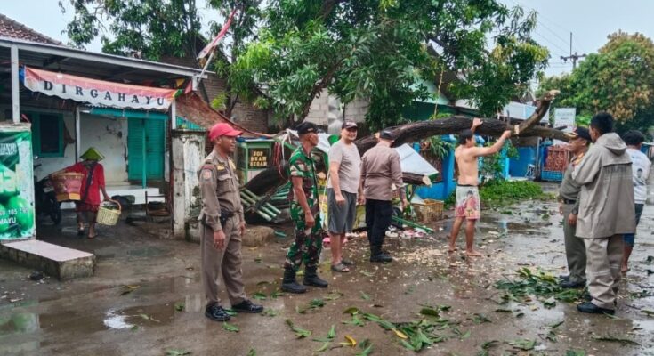 JAWA BARAT, Personel Polsek Sliyeg Polres Indramayu Polda Jabar bersama TNI dan Satpol PP bergerak cepat mengevakuasi pohon tumbang yang melintang di jalan raya Desa Gadingan, Kecamatan Sliyeg, Kabupaten Indramayu, Selasa (12/8/2025).
