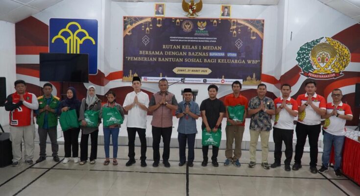 Medan – Dalam rangka menjalankan 13 Program Akselerasi Menteri Imigrasi Dan Pemasyarakatan, Bapak Agus Andrianto, yakni pada poin ke-4, bantuan sosial kepada keluarga warga binaan yang kurang mampu dan masyarakat sekitar UPT, Rumah Tahanan Negara (Rutan) Kelas I Medan Kanwil Ditjenpas Sumut bekerjasama dengan Badan Amil Zakat Nasional (Baznas) Provinsi Sumatera Utara membagikan 50 Paket Bantuan Sosial berupa sembako kepada 50 Orang Keluarga Warga Binaan yang kurang mampu. Jumat (21/3/25).