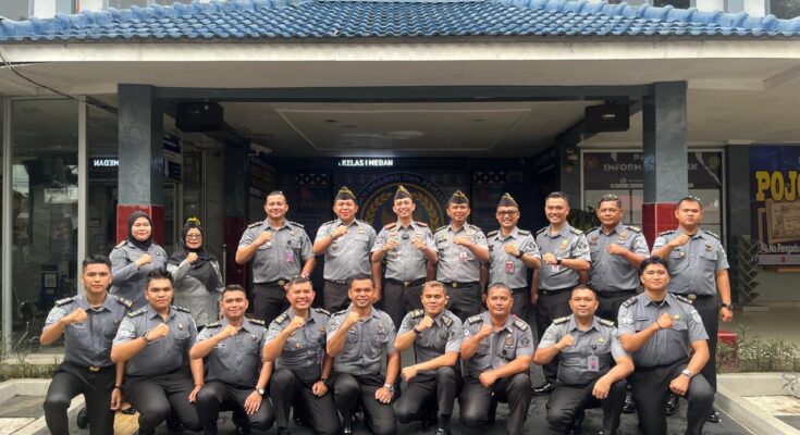 Medan – Rumah Tahanan Negara (Rutan) Kelas I Medan Kanwil Ditjenpas Sumut menggelar Apel Pagi Penyematan Tanda Pangkat Pegawai Negeri Sipil, Kenaikan Pangkat Setingkat Lebih Tinggi dan Pelepasan Pegawai Purna Tugas Periode 01 April 2025, terhadap 14 Orang pegawai yang naik pangkat dan 1 Orang pegawai Purna Tugas. Senin (5/5).