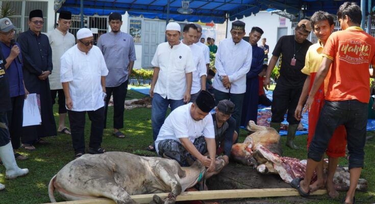 Kegiatan dilanjutkan dengan penyembelihan hewan Qurban. Kepala Rutan Kelas I Medan, Andi Surya, menyampaikan pelaksanaan sholat ied dan pemotongan hewan Qurban sebagai bagian dari upaya membina dan meningkatkan keimanan serta ketakwaan para warga binaan.