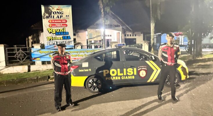 CIAMIS ~ Unit Patroli Sat Samapta Polres Ciamis Polda Jabar melaksanakan Patroli Biru di wilayah rawan tindak kriminalitas dan balapan liar di Kabupaten Ciamis. Patroli ini dilaksanakan di kawasan Jalan Raya Depan Ruko Terminal Ciamis, Ciamis, Kabupaten Ciamis, Jawa Barat, Kamis (18/12/2025), dini hari