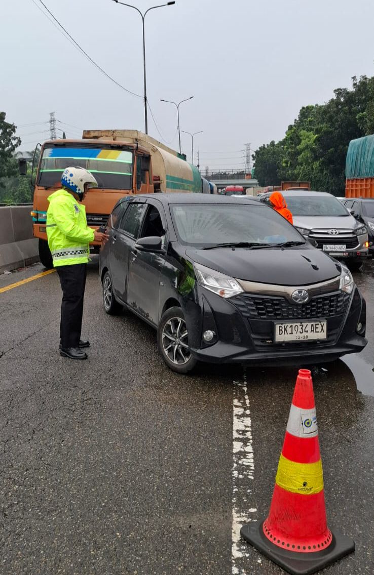 Belawan — Sat Lantas Polres Pelabuhan Belawan melakukan rekayasa lalu lintas berupa contra flow atau lawan arus terhadap kendaraan yang hendak menuju kawasan Belawan melalui ruas Jalan Tol, Jumat (28/11/2025). Langkah ini dilakukan setelah banjir setinggi ±1 meter menggenangi ruas Tol arah Belawan, tepatnya di kawasan Cingwan, sehingga arus kendaraan tidak dapat melintas secara normal.