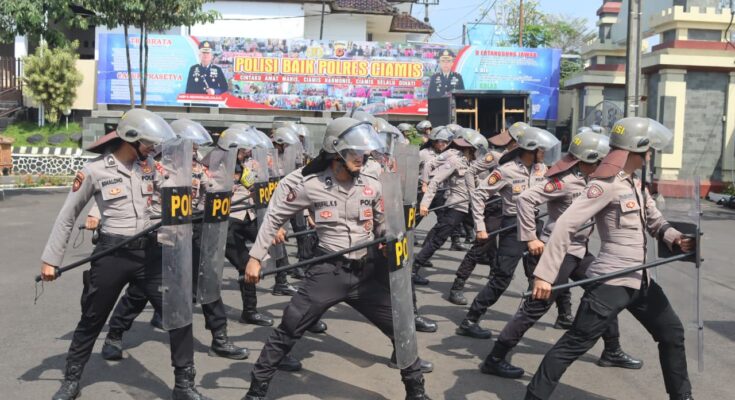CIAMIS ~ Polres Ciamis Polda Jabar menyiapkan personel dalam rangka penanggulangan serangan fisik ke Markas Kepolisian Polres Ciamis. Salah satu bentuk kesiapan yang dilakukan dengan meningkatkan setiap kemampuan personel Polri khususnya Satuan Samapta Polres Ciamis Polda Jabar. Puluhan personel disiapkan di halaman Apel Makopolres Ciamis, Jalan Jenderal Sudirman No.271, Sindangrasa, Ciamis, Kabupaten Ciamis, Jawa Barat, Rabu (24/9/2025).