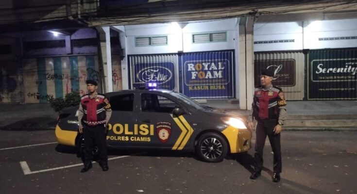 CIAMIS ~ Unit Patroli Sat Samapta Polres Ciamis Polda Jabar melaksanakan Patroli Biru di wilayah rawan tindak kriminalitas dan balapan liar di Kabupaten Ciamis. Patroli ini dilaksanakan di kawasan Ruko Terminal Ciamis, Kabupaten Ciamis, Jawa Barat, Senin, 28 April 2025, malam.