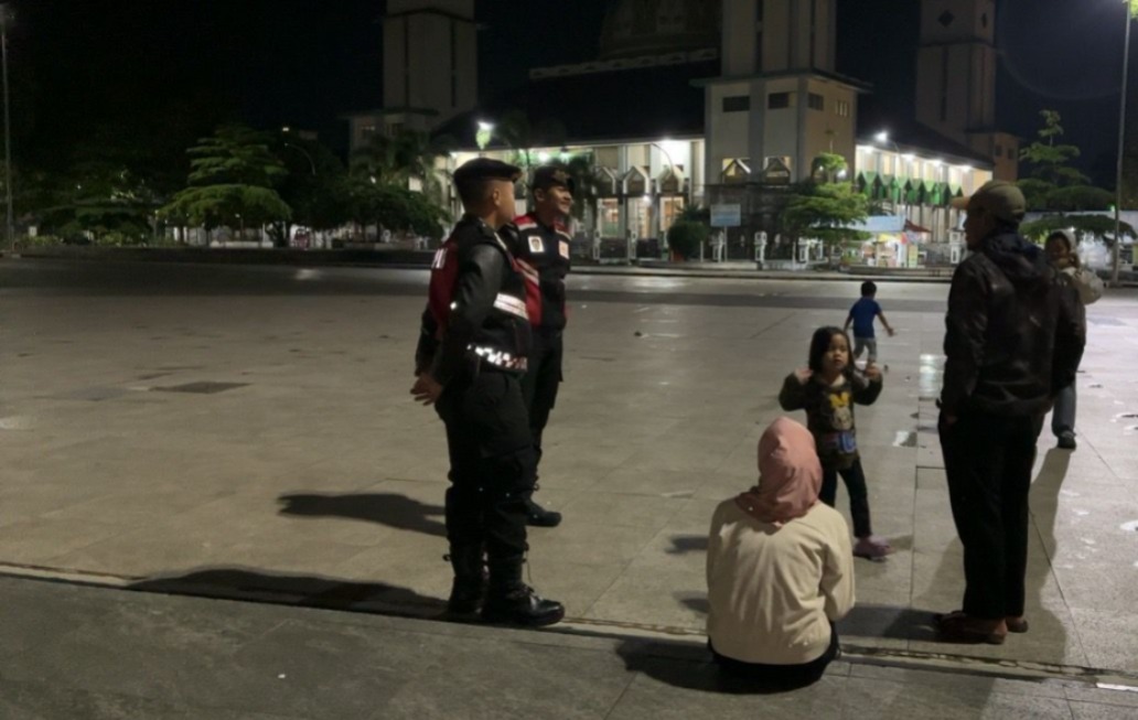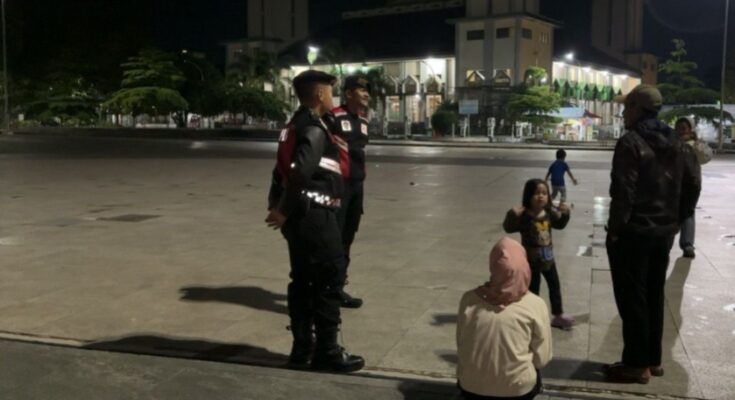 Sejumlah petugas terlihat berkeliling menggunakan kendaraan dinas dan melakukan dialog singkat dengan warga serta pedagang yang beraktivitas di area tersebut.