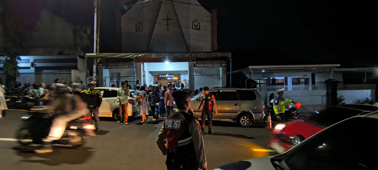 Tak hanya sterilisasi, personel Polri turut disiagakan untuk pengamanan selama kegiatan Ibadah Hari Malam Tahun Baru. Salah satunya dilakukan di Gereja Pantekosta di Indonesia Imanuel Ciamis, Jalan Ir. H. Juanda No.231, Ciamis, Kabupaten Ciamis, Jawa Barat, Rabu, 31 Desember 2025, malam.