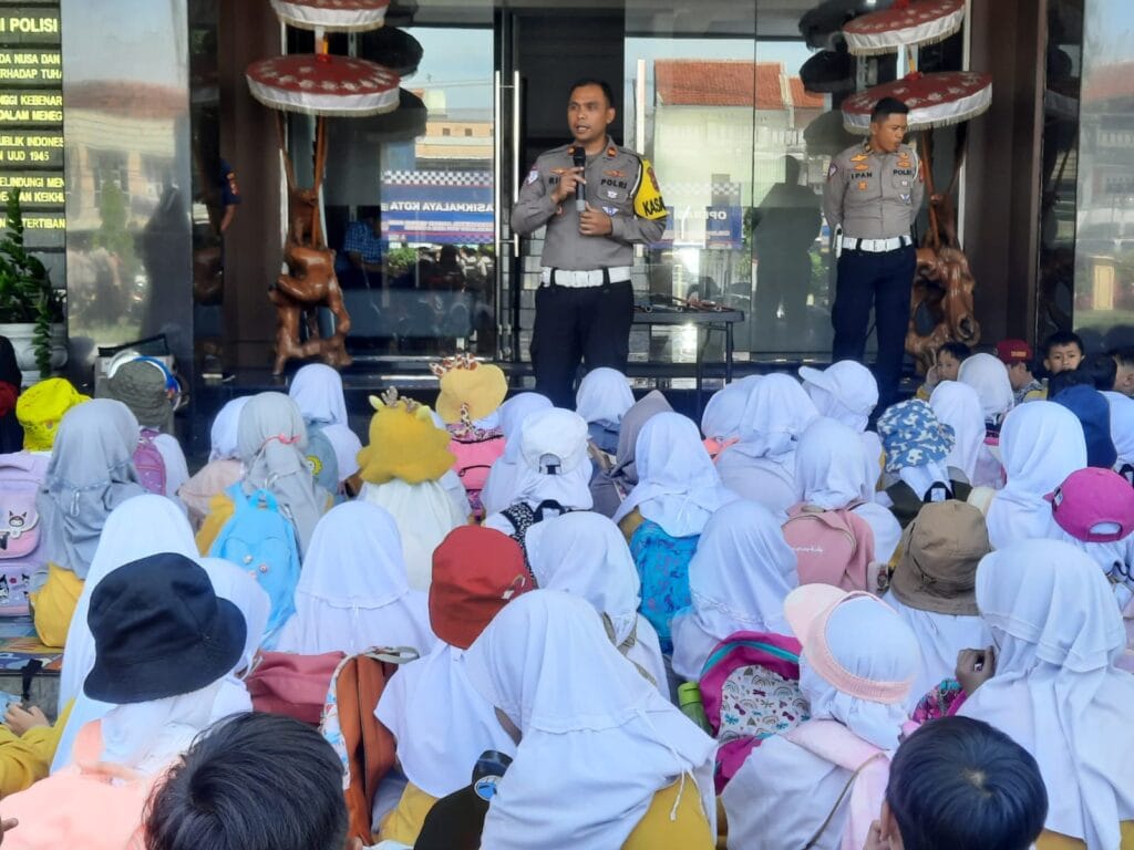 Polres Tasik Kota—- Satuan Lalu Lintas Polres Tasikmalaya Kota sosialisasikan Dikmas tertib berlalulintas kepada pelajar SD Baiturahman di halaman Mapolres Tasikmalaya Kota, Rabu (16/10/24)