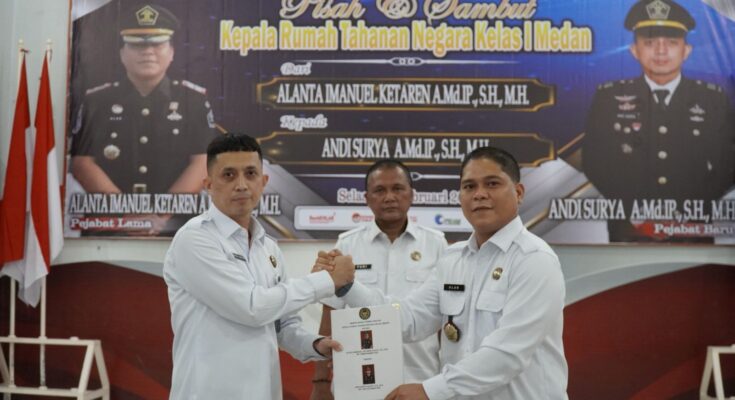 MEDAN , Jejak-kriminal.com – Tongkat kepemimpinan resmi berganti, Rumah Tahanan Negara (Rutan) Kelas I Medan Kanwil Ditjenpas Sumut menggelar serah terima jabatan (Sertijab) dan pisah sambut kepala rutan dari pejabat lama Alanta Imanuel Ketaren kepada pejabat yang baru Andi Surya. Selasa (25/2).