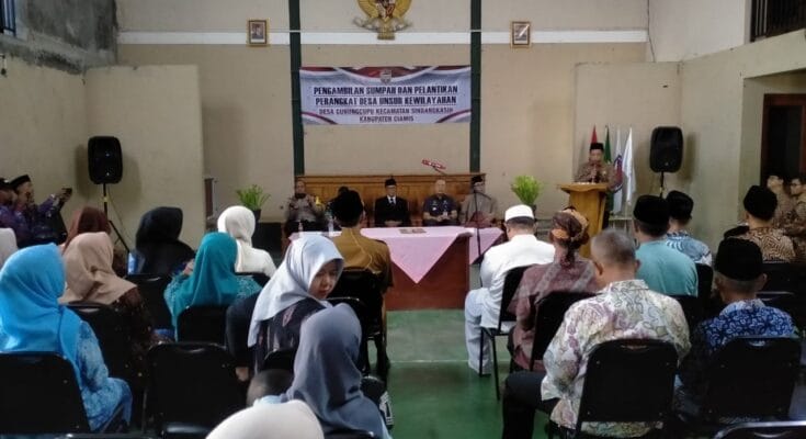 CIAMIS ~ Polsek Cikoneng Polres Ciamis Polda Jabar menghadiri pelantikan perangkat Desa Sukanagara yakni Kepala Dusun Desakidul. Pelantikan ini berlangsung di Aula Kantor Desa Gunungcupu, Kecamatan Sindangkasih, Kabupaten Ciamis, Jawa Barat, Jumat (17/1/2025).