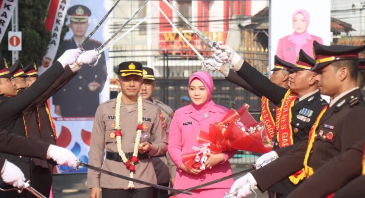 Kapolres Garut AKBP Yugi Bayu Hendarto , S.I.K., M.A.P., beserta Ny.Intan Yugi di sambut dengan rangkaian kegiatan jajar hormat , pedang pora , pertunjukan seni budaya sunda dan pengenalan seluruh perwira dan personel Polres Garut.