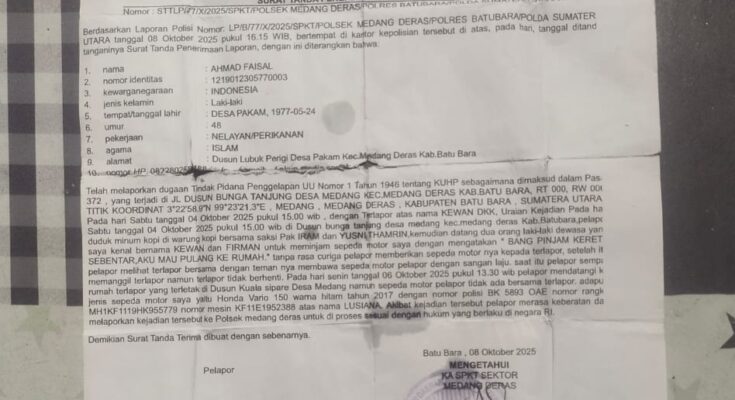 Nomor: STTLP/77/X/2025/SPKT/Polsek Medang deras/Polres Batu Bara/Polda Sumut, tertanggal 8 Oktober 2025, ditandatangi Kepala SPKT Bripka Agus Setiadi.
