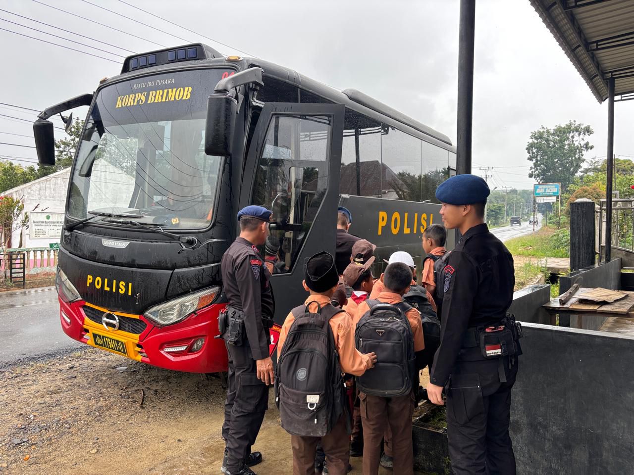 Para siswa tampak gembira saat dijemput oleh personel berseragam Brimob, sementara para orang tua menyampaikan rasa terima kasih dan apresiasi atas perhatian yang diberikan kepada anak-anak mereka.